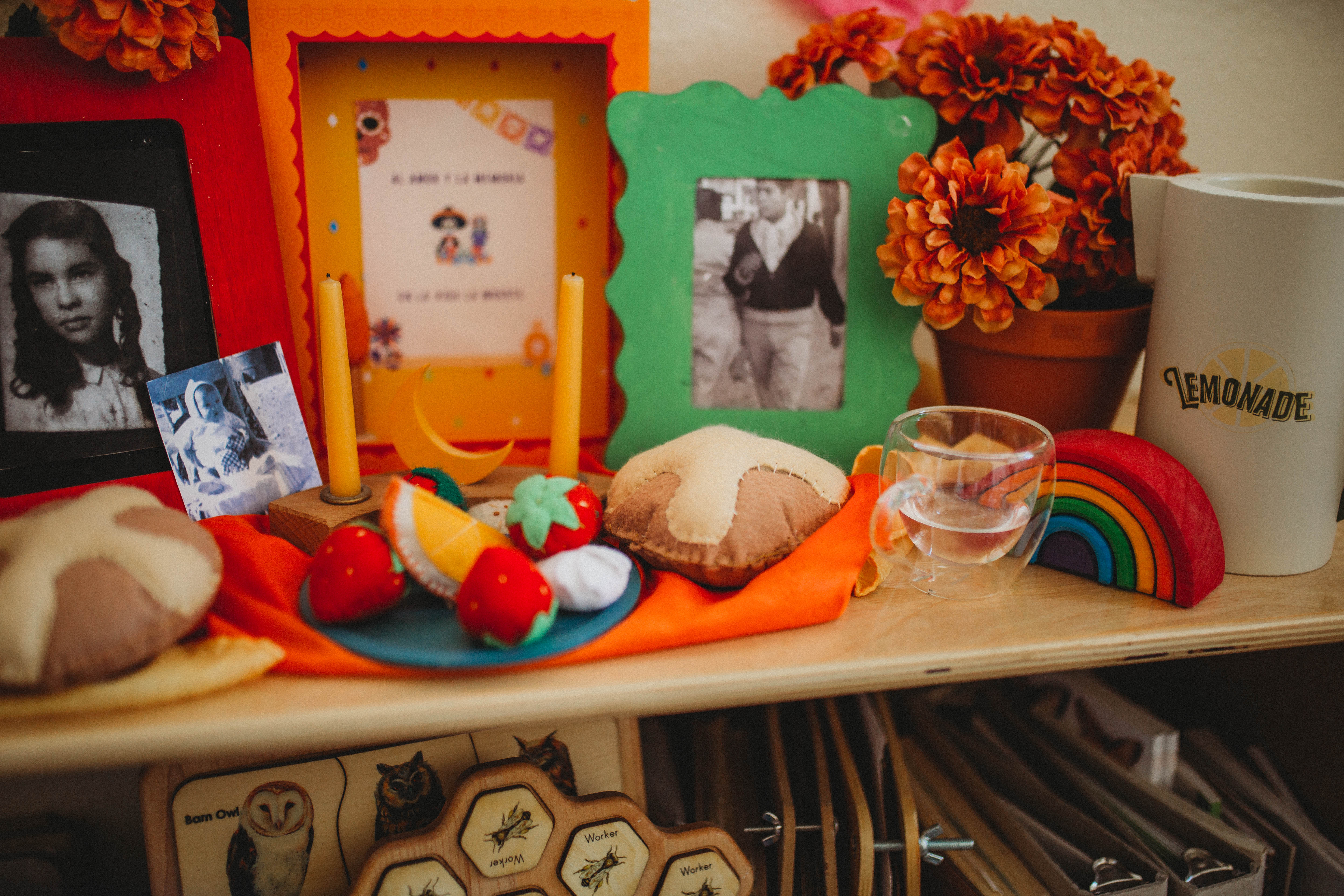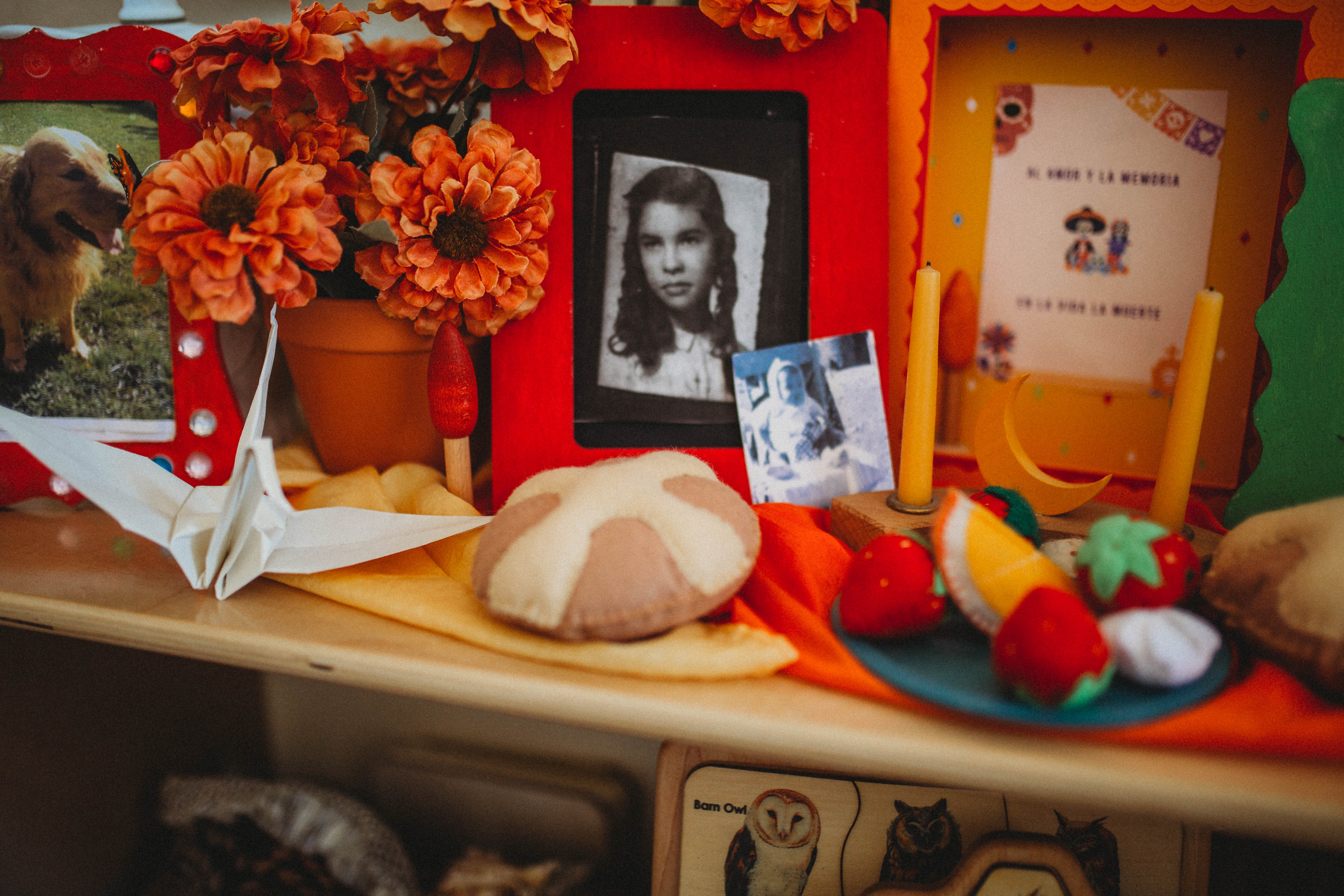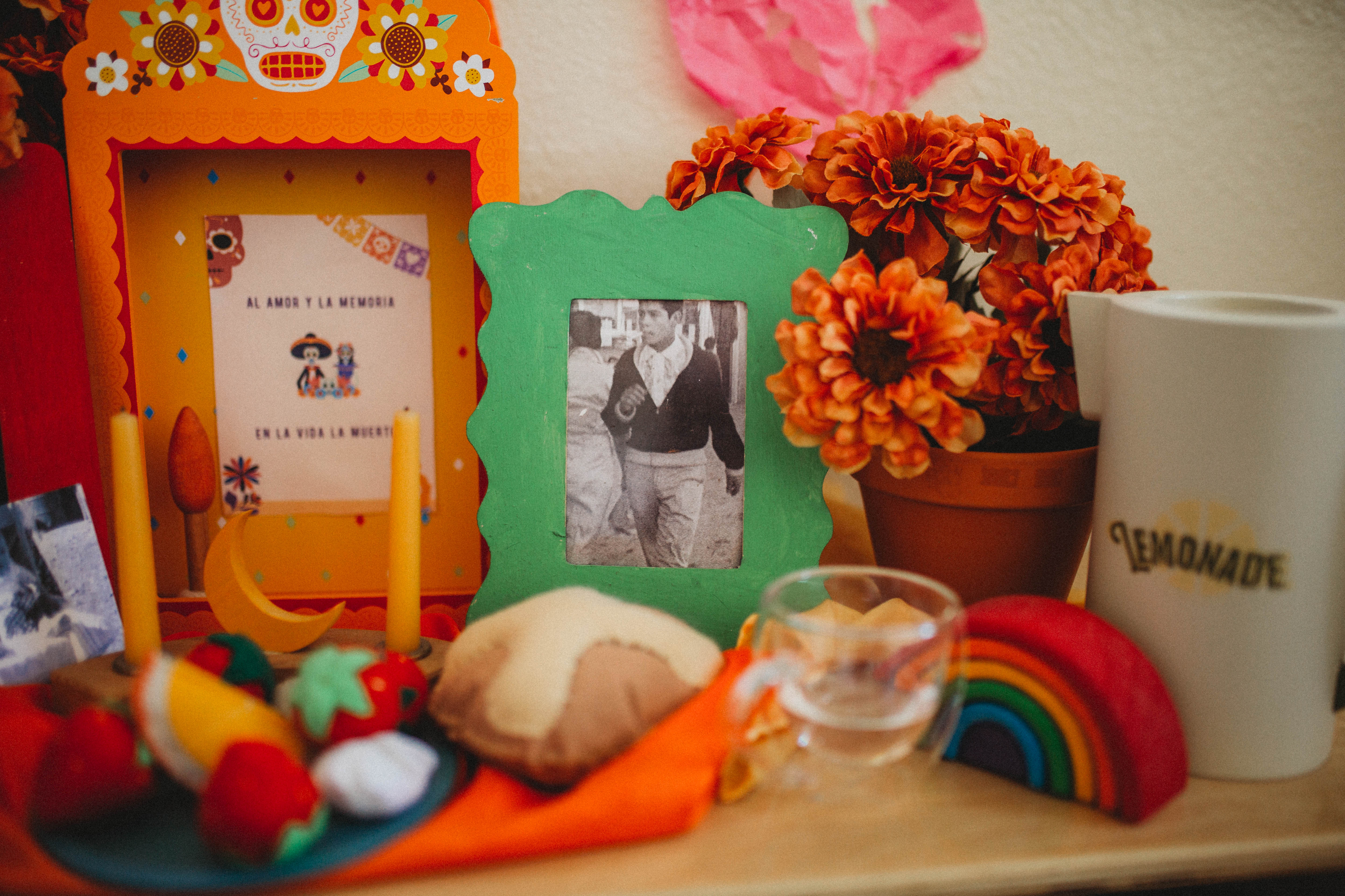 Last year we added my grandma who passed away and my heart just broke. It felt like the movie one of the ending scenes when you were just broken and sad. I was very sad to see my grandma on our ofrenda, but happy to know they (my grandparents) are together again. I miss my grandma everyday, and I know my girls do to. Sharing their weekly handwork on facetime and watching not only their grandma but great grandma beam with pride. But my girls feel so proud to place her on our ofrenda with my papa, and that’s an important lesson I’m learning from my girls. That this holiday is a celebration of life and we are honoring her and keeping her memory alive. This year we decided to add my grandparents son, who not even my own mommy met. But the girls felt it was important as my grandma would head to Mexico every year to visit him and place flowers on this Holiday. It’s something they remember my mommy telling them so the girls wanted to make sure he had a place there too.