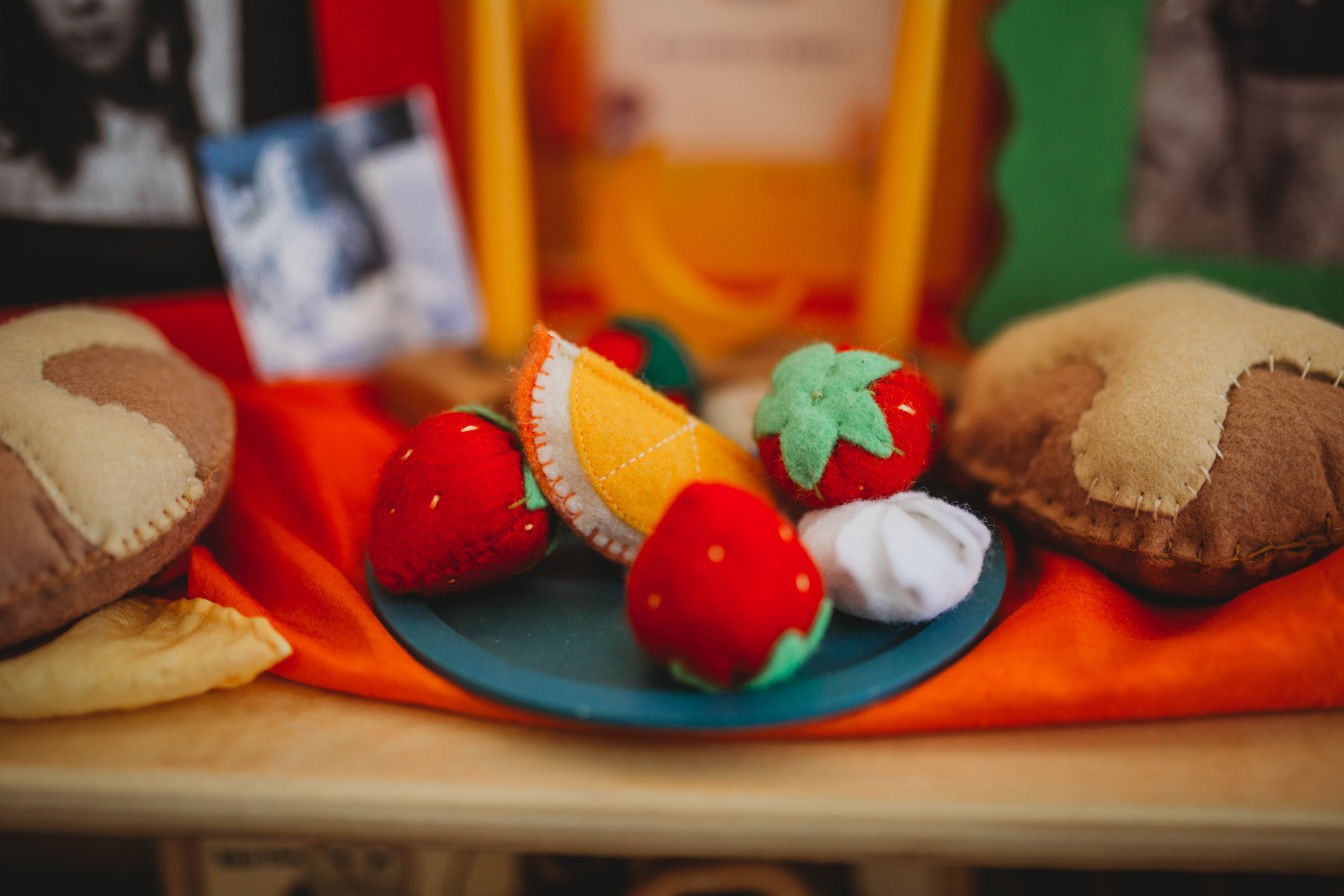 So the girls and I made some “pan de muerto” out of felt with our handwork skills. I really wanted the girls to feel in control of this and make their own design, because in real life no real two breads are alike. We also added a cup of water, a lemonade container because my grandma always made “Limeade” from fresh limes from the trees in the backyard. I will always remember the taste of my grandmas fresh limeade after running around the backyard to the front yard with my siblings and cousins. So placing this wooden container brought back happy memories. This is what this ofrenda is about, celebrating the memories of our family. The girls also added some of the felted food I made them because they decided what they would like or recall stories from my mommy of her parents. We added some candles, a moon because my grandparents last name is “Luna”, also another reason for our blog name. I’m truly in love with the work the girls put into this beautiful “ofrenda” for my grandparents, my uncle, and my family dog chase.