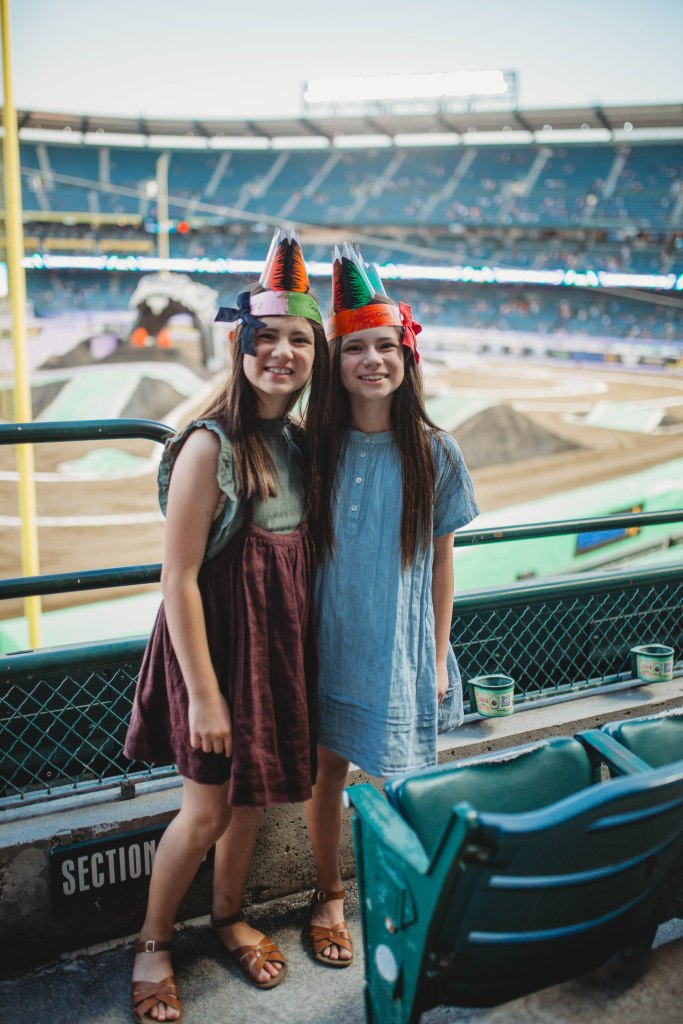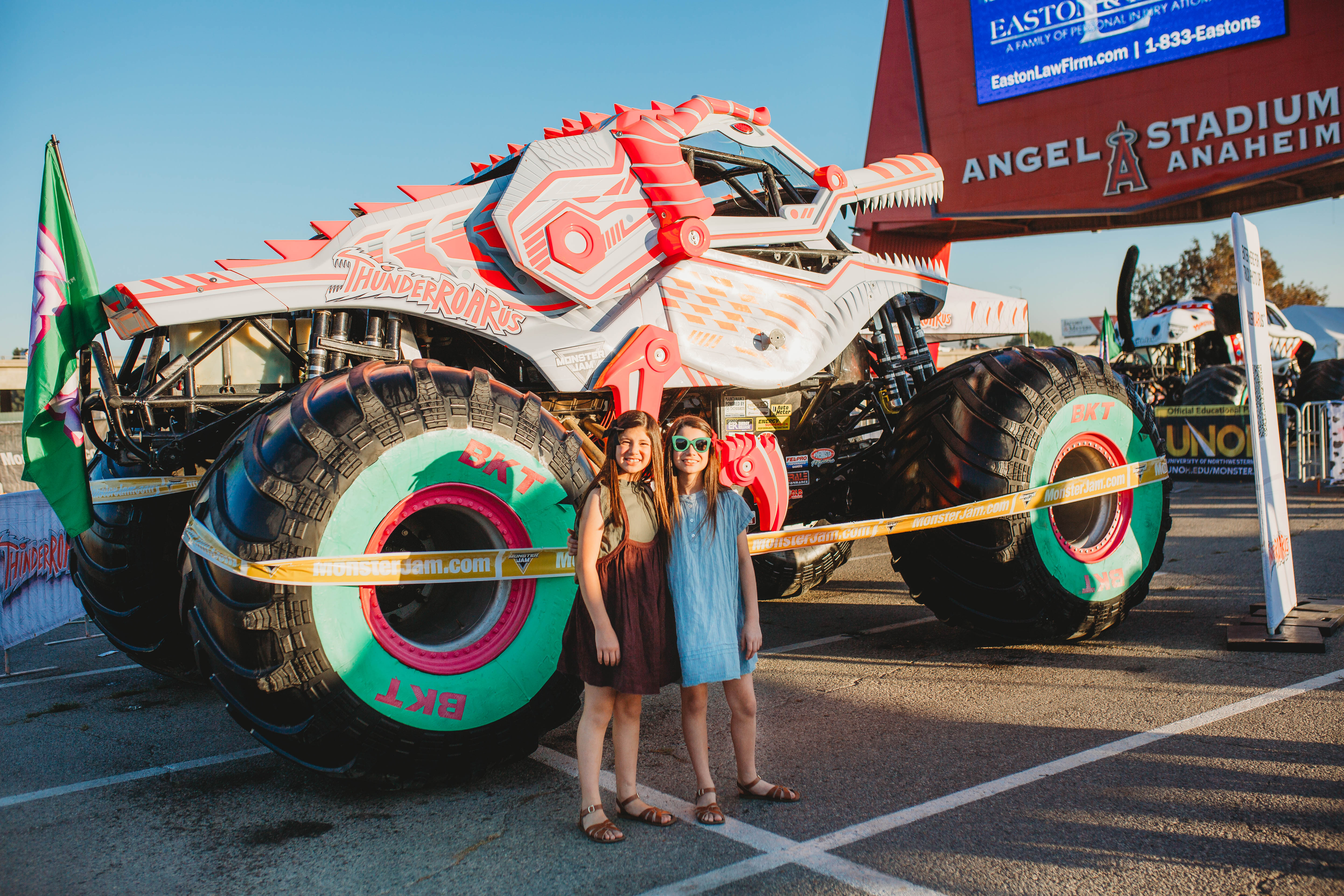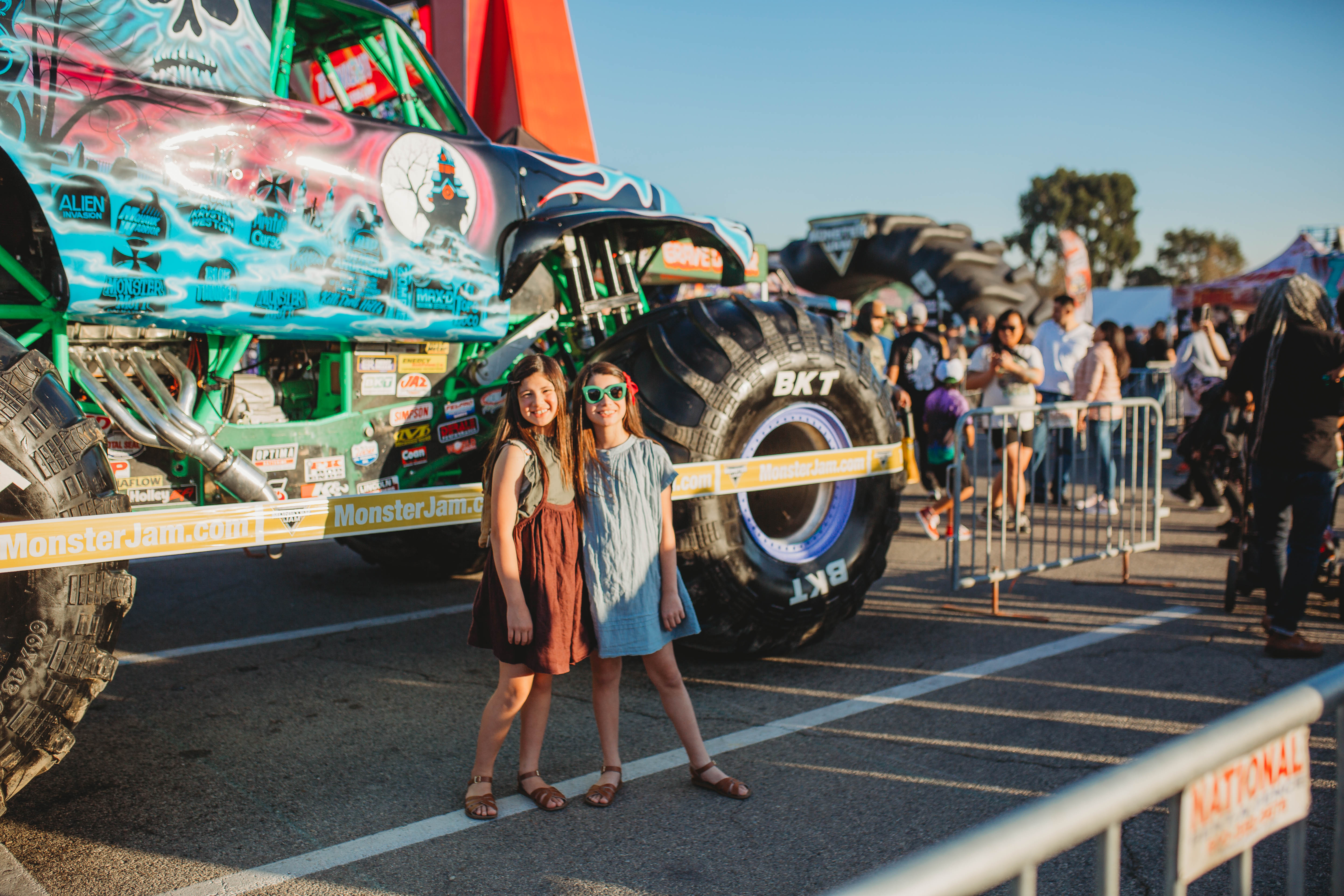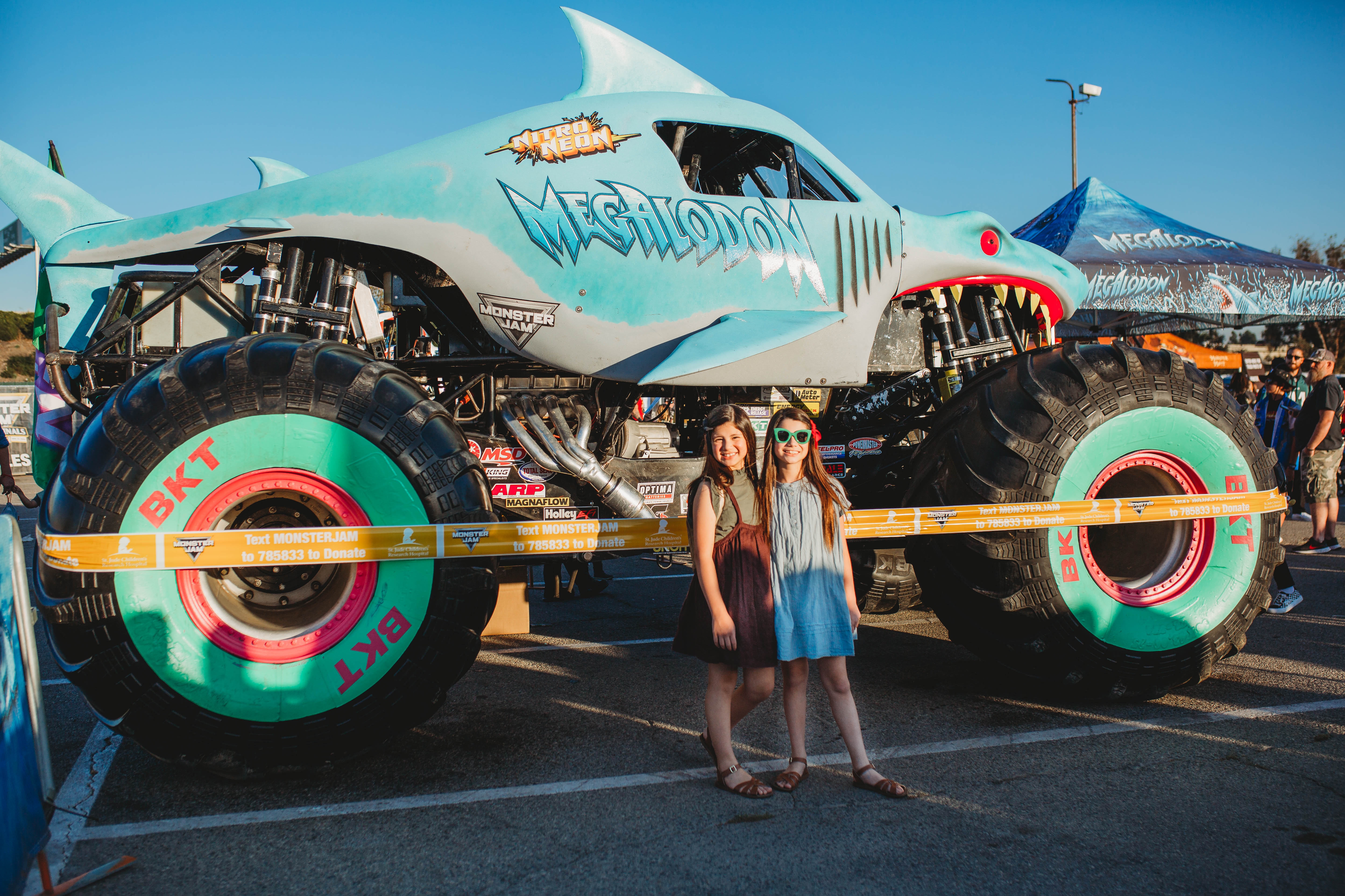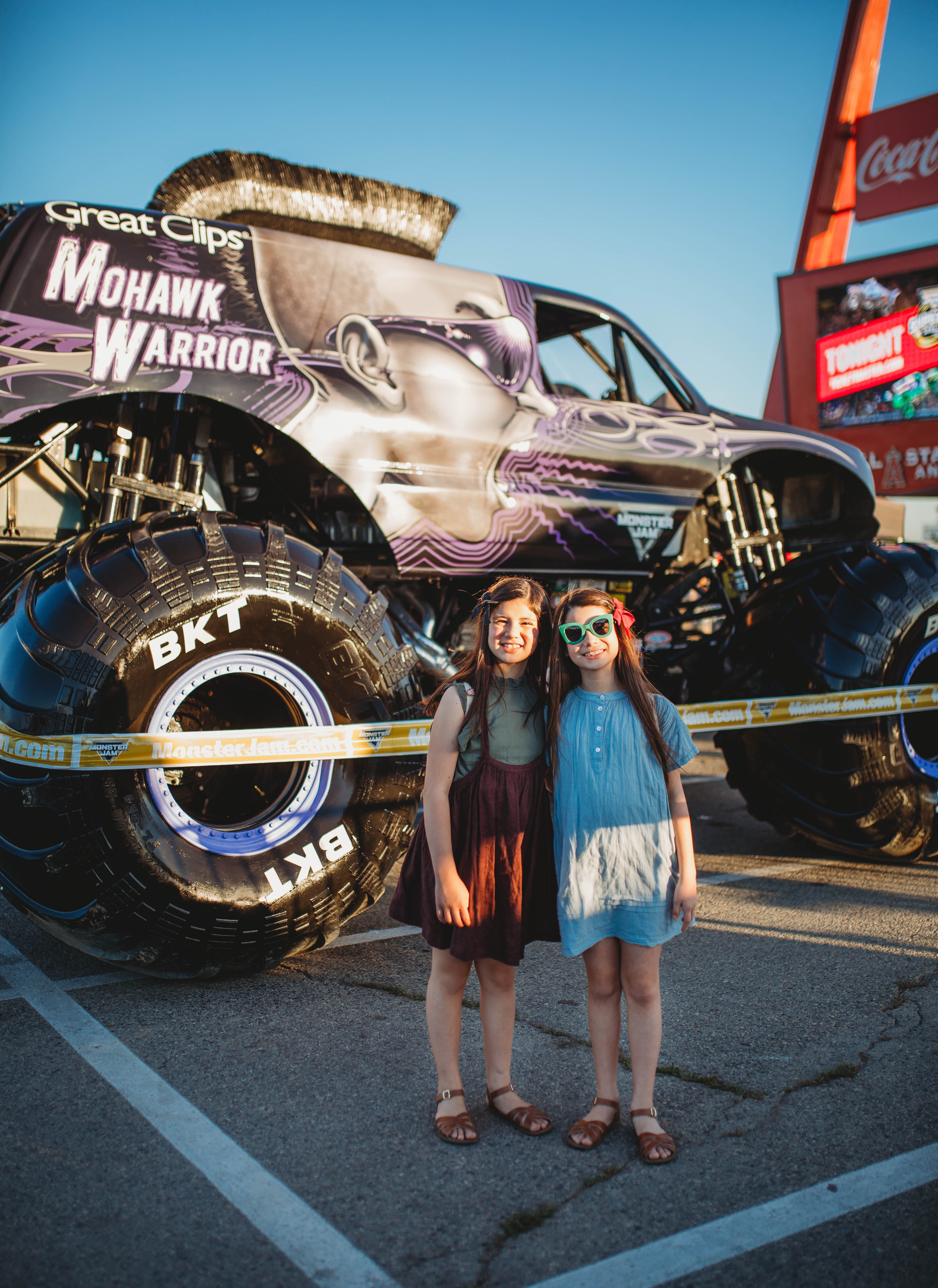 We started our First Monster Jam the moment we arrived at Angels Stadium with the Pit Party! The girls got to color some monster trucks, collect tattoos, stickers, catch a show and take photos with the trucks themselves! Kennedy went with matching grave digger in wearing purple, green and topping it off with a black bow! Skye wore a blue dress, green glasses and red bow to represent Megalodon!