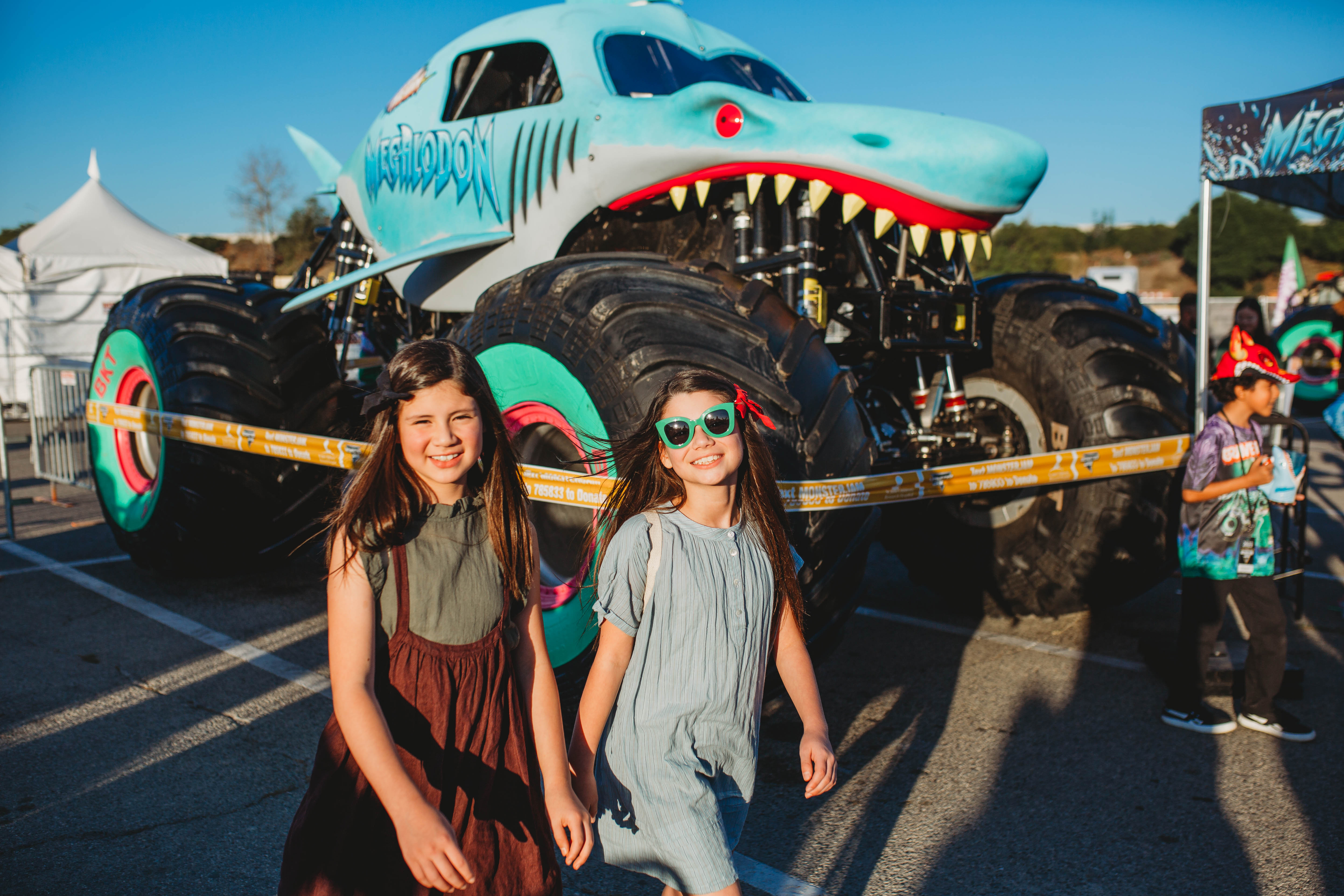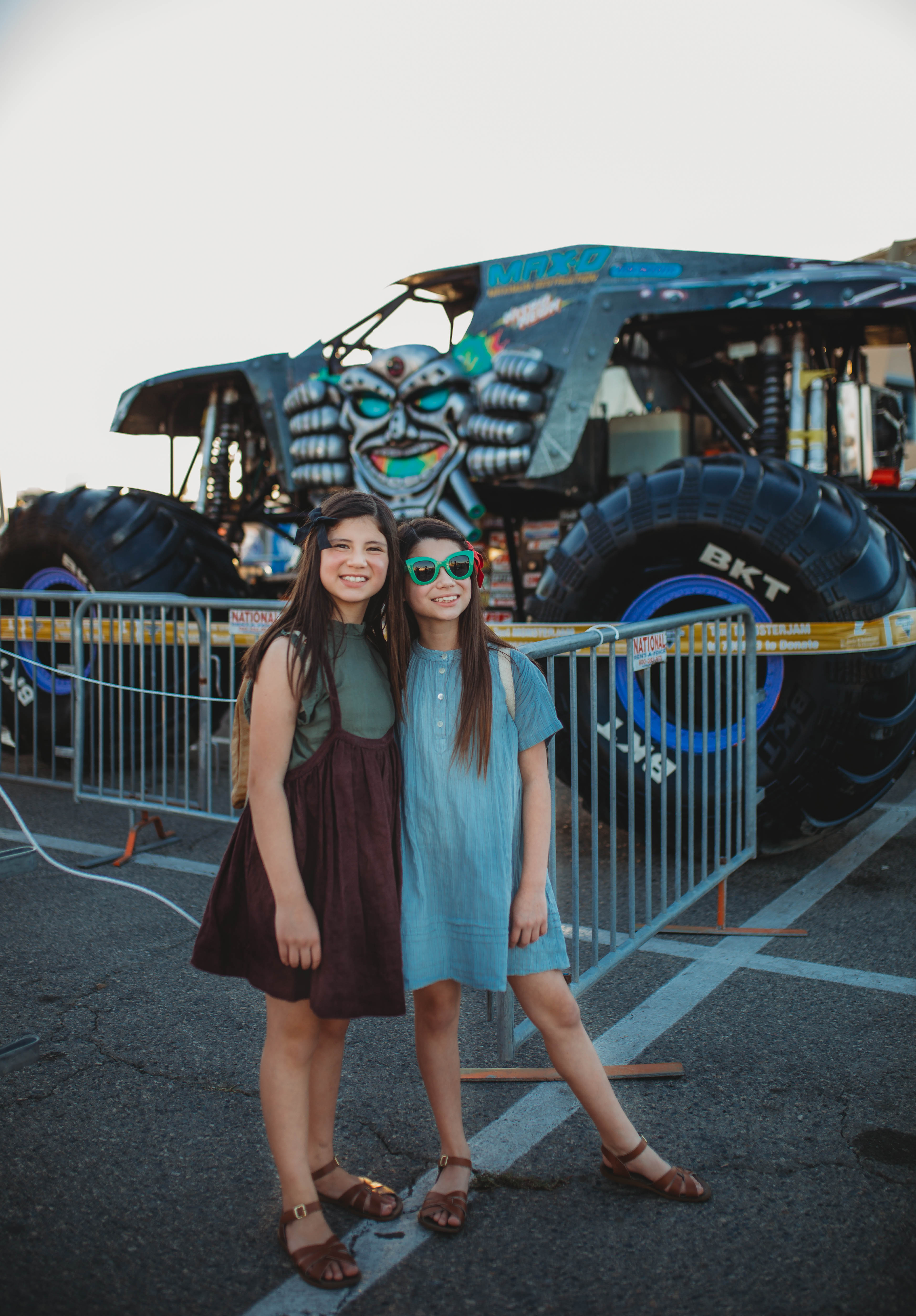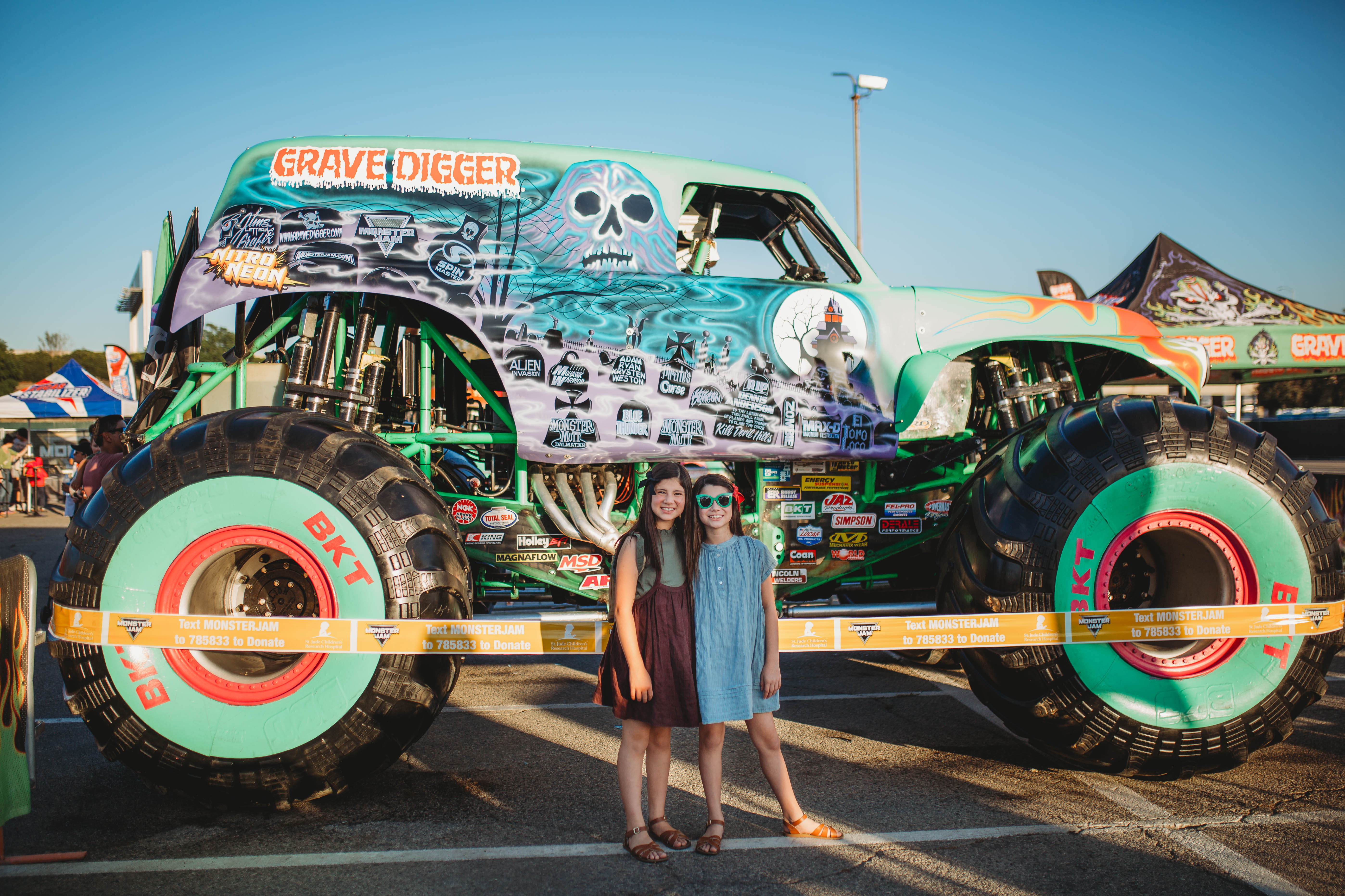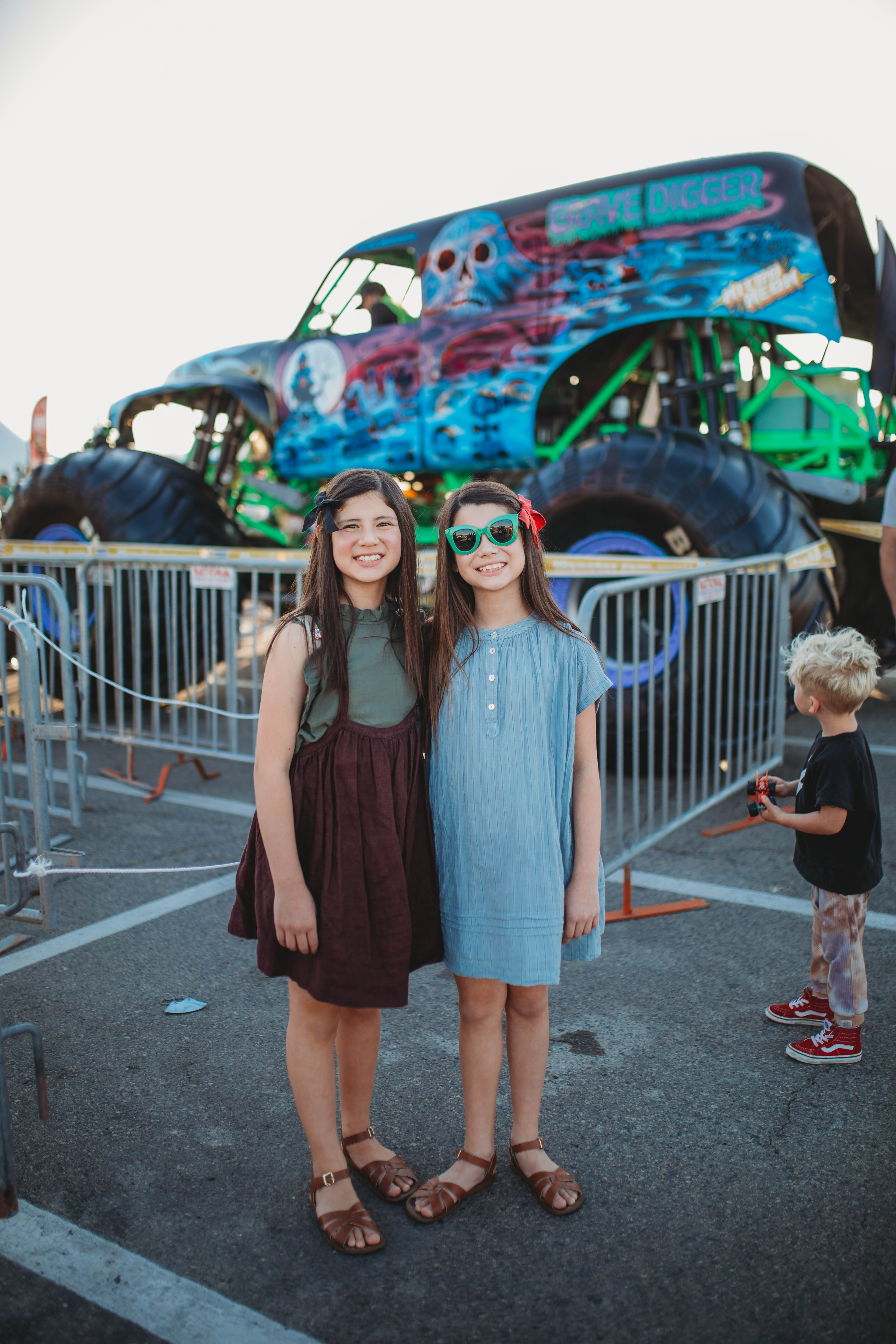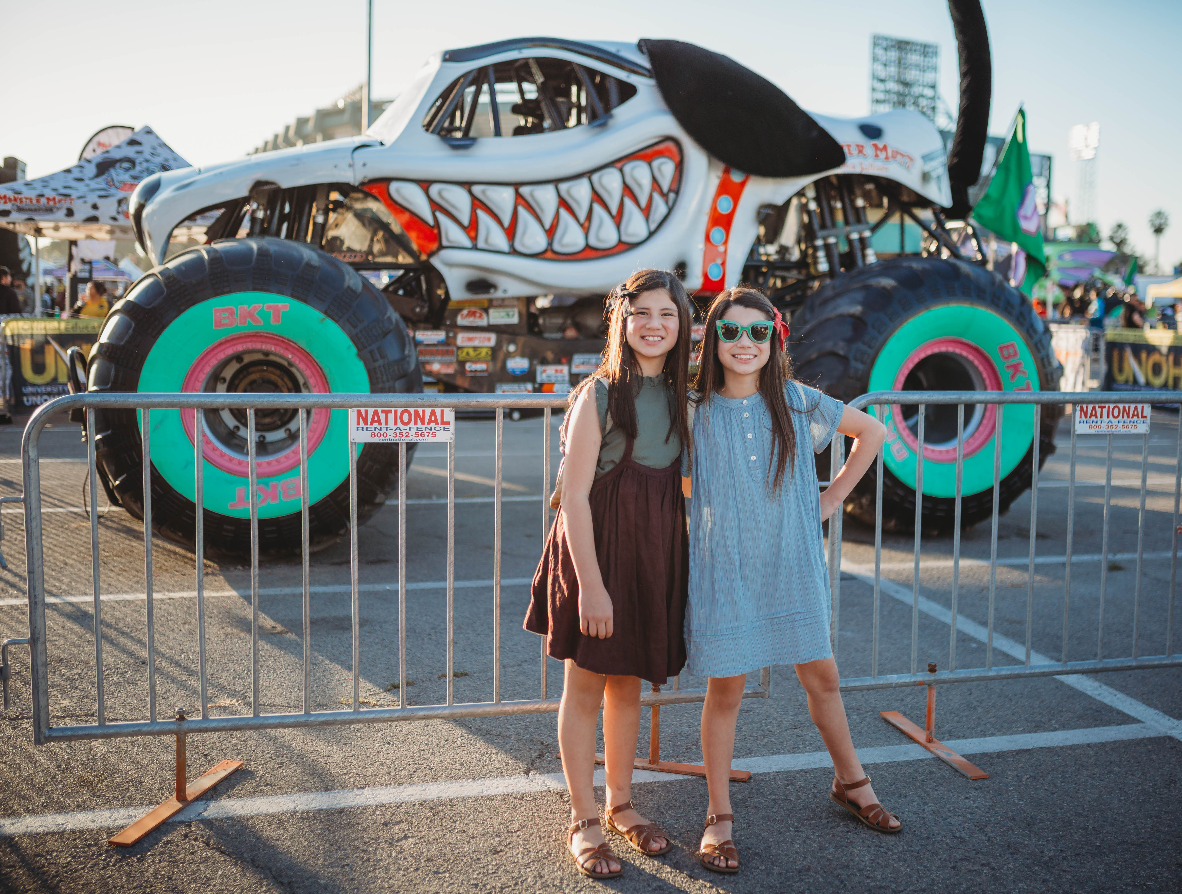 We started our First Monster Jam the moment we arrived at Angels Stadium with the Pit Party! The girls got to color some monster trucks, collect tattoos, stickers, catch a show and take photos with the trucks themselves! Kennedy went with matching grave digger in wearing purple, green and topping it off with a black bow! Skye wore a blue dress, green glasses and red bow to represent Megalodon!