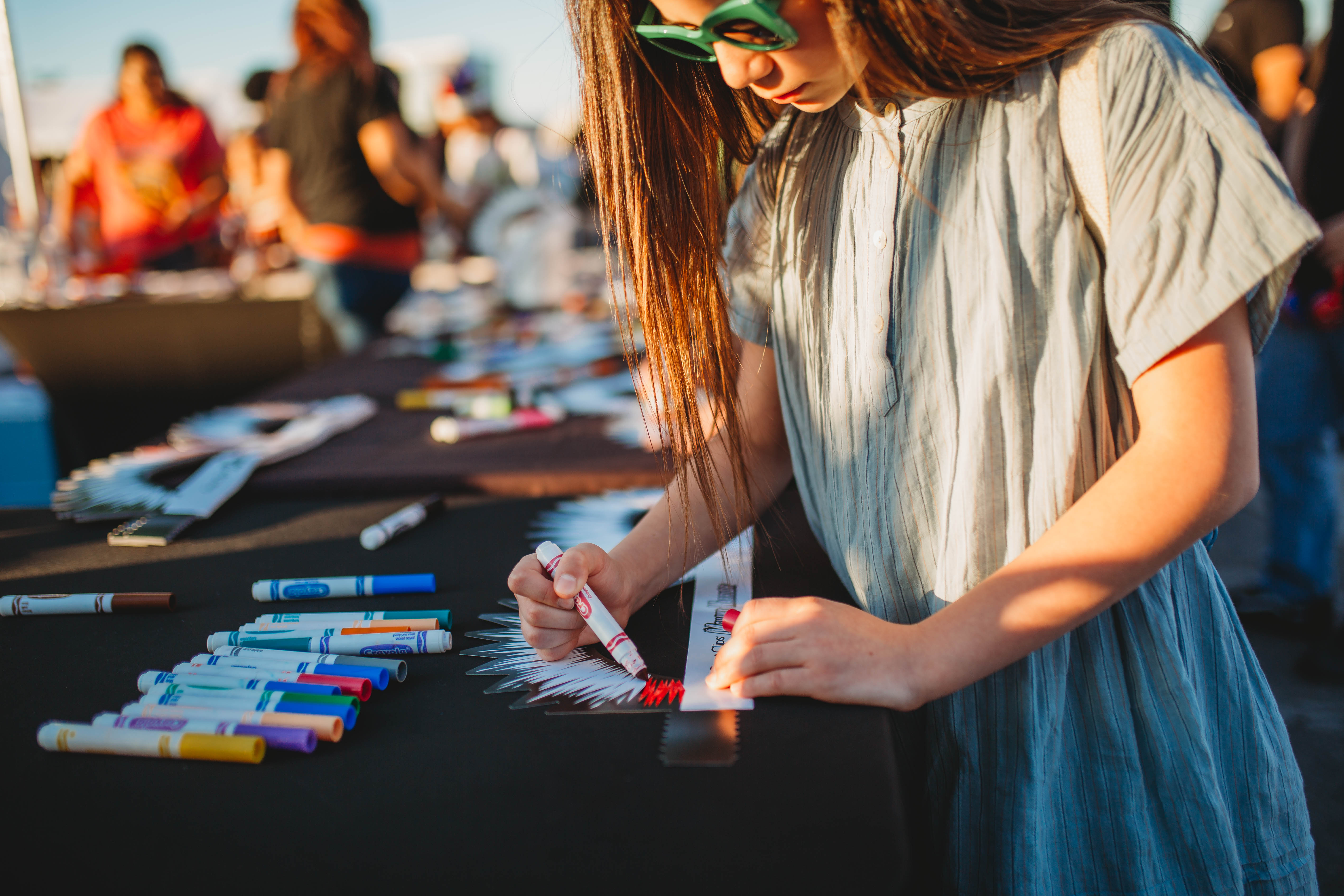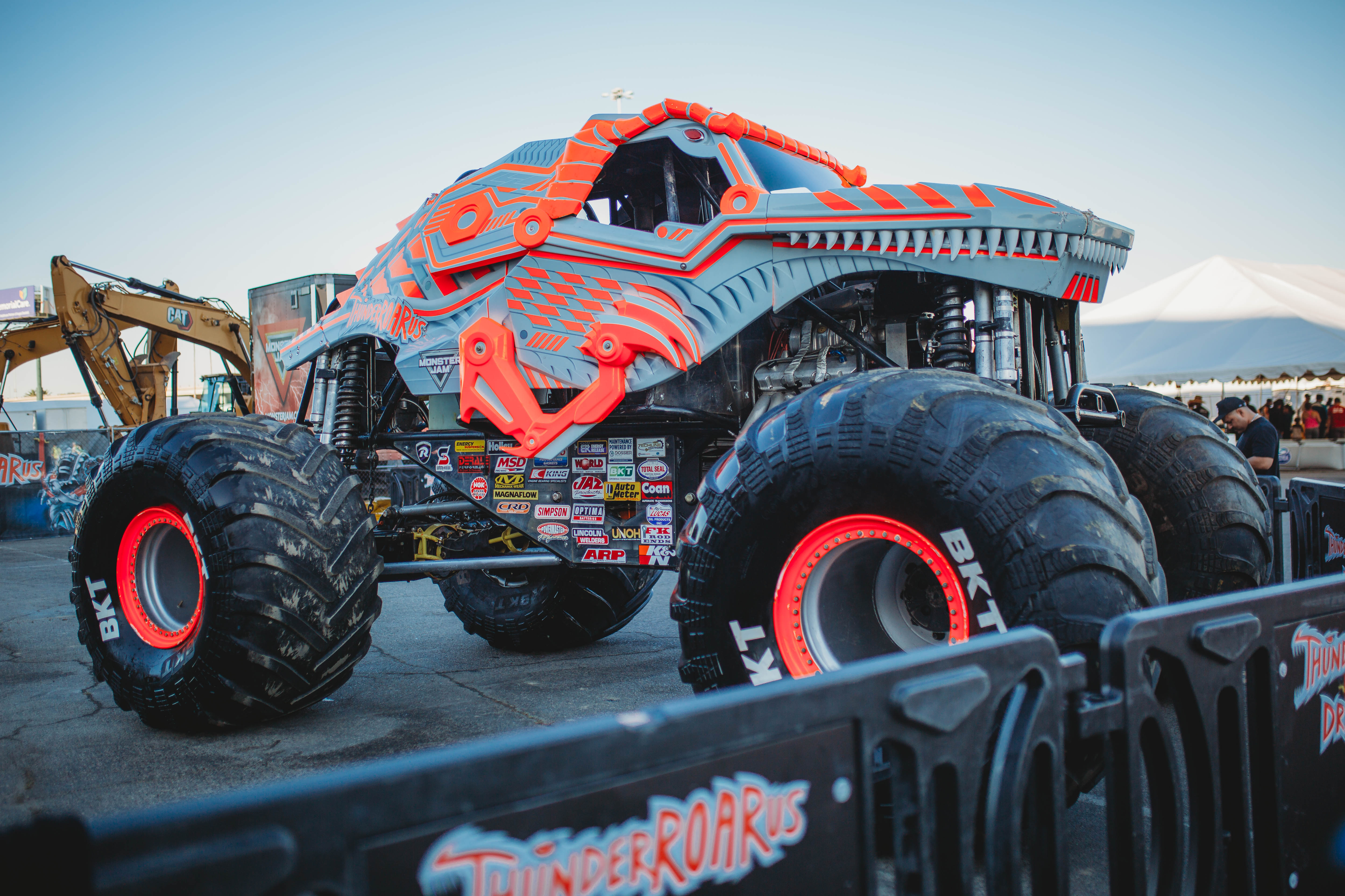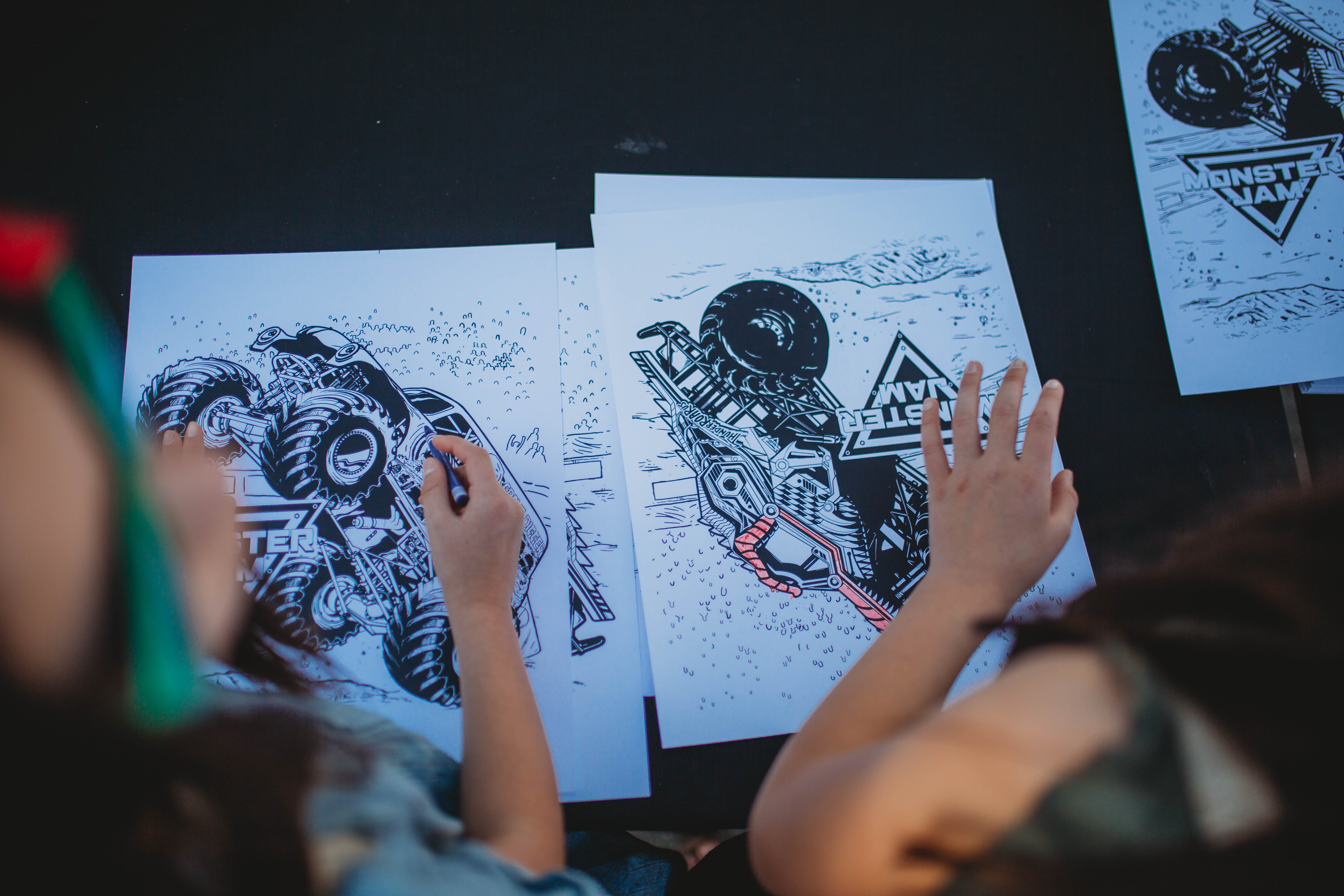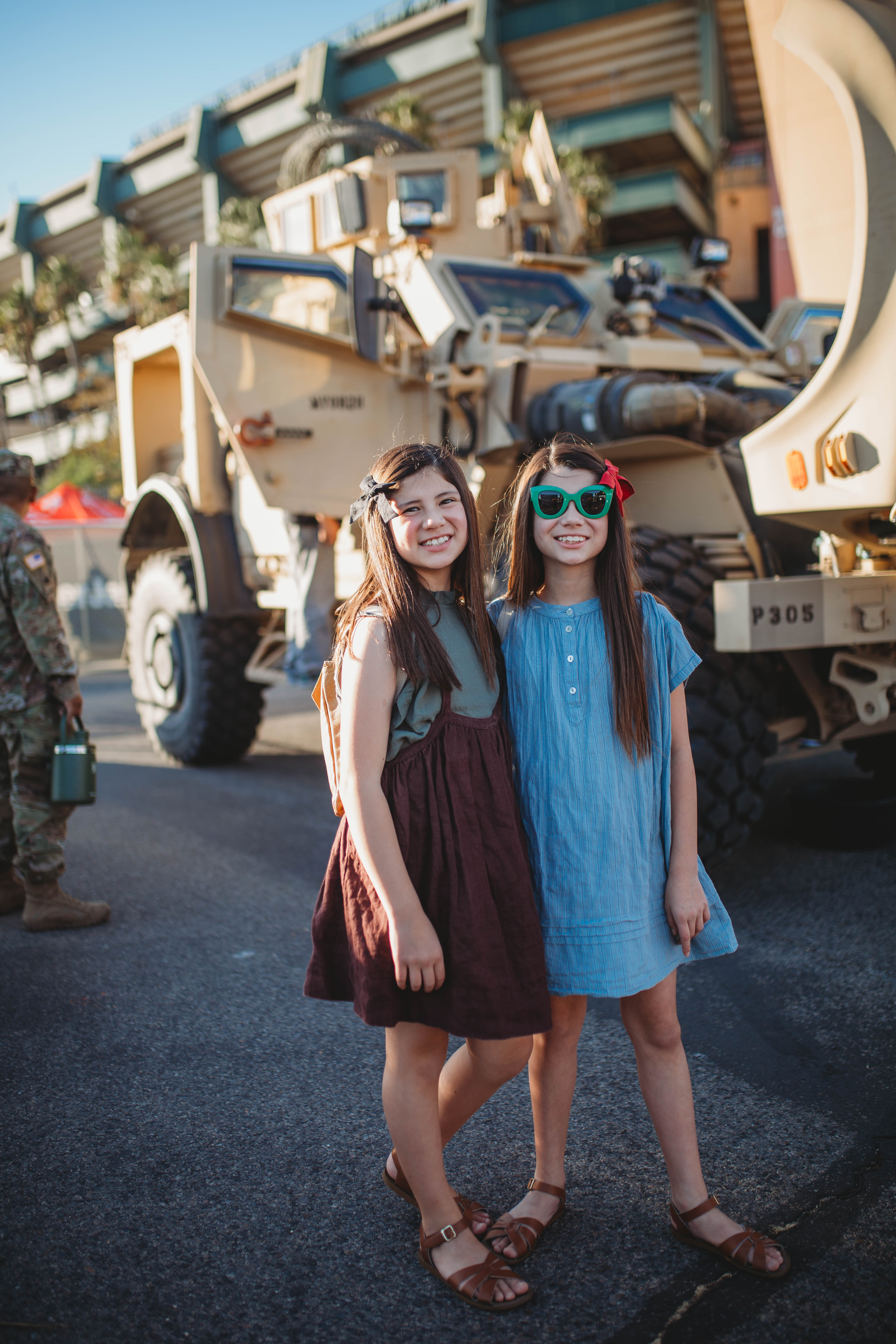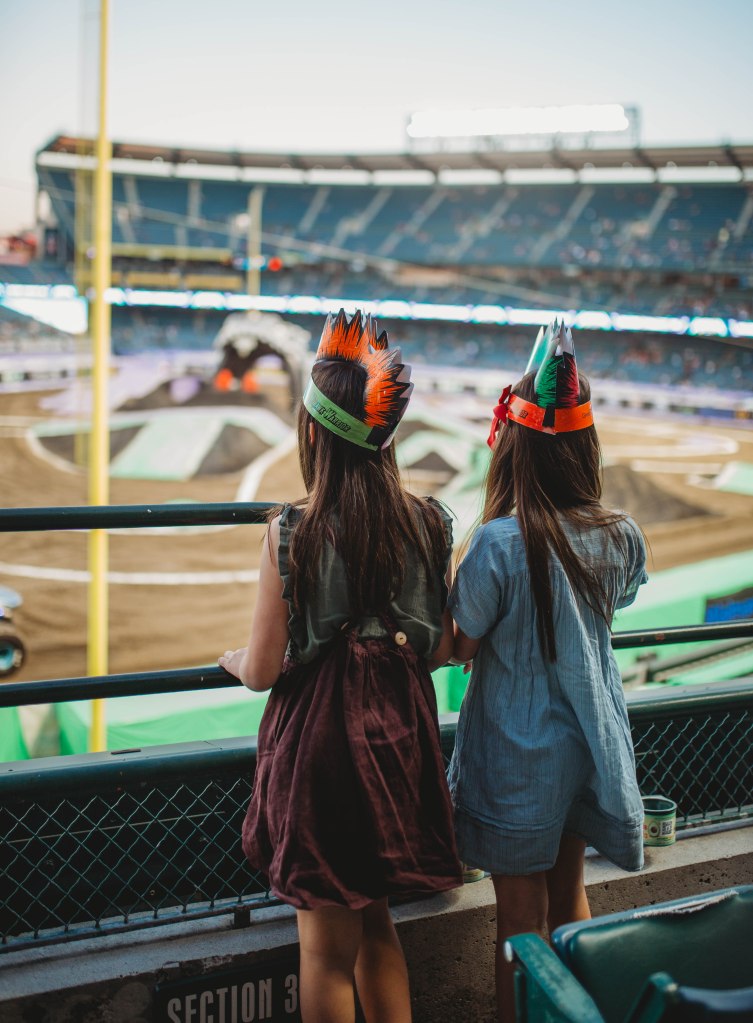 We started our First Monster Jam the moment we arrived at Angels Stadium with the Pit Party! The girls got to color some monster trucks, collect tattoos, stickers, catch a show and take photos with the trucks themselves! Kennedy went with matching grave digger in wearing purple, green and topping it off with a black bow! Skye wore a blue dress, green glasses and red bow to represent Megalodon!