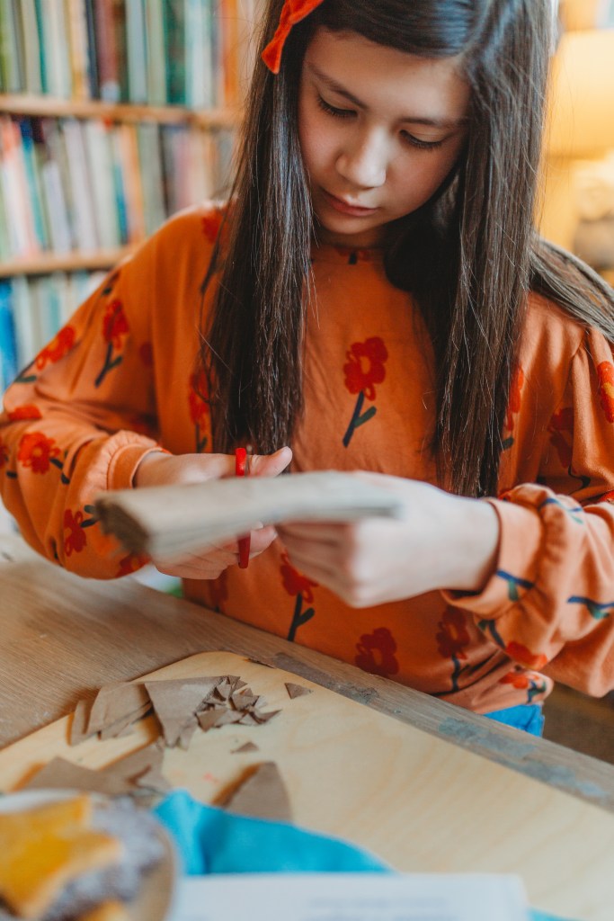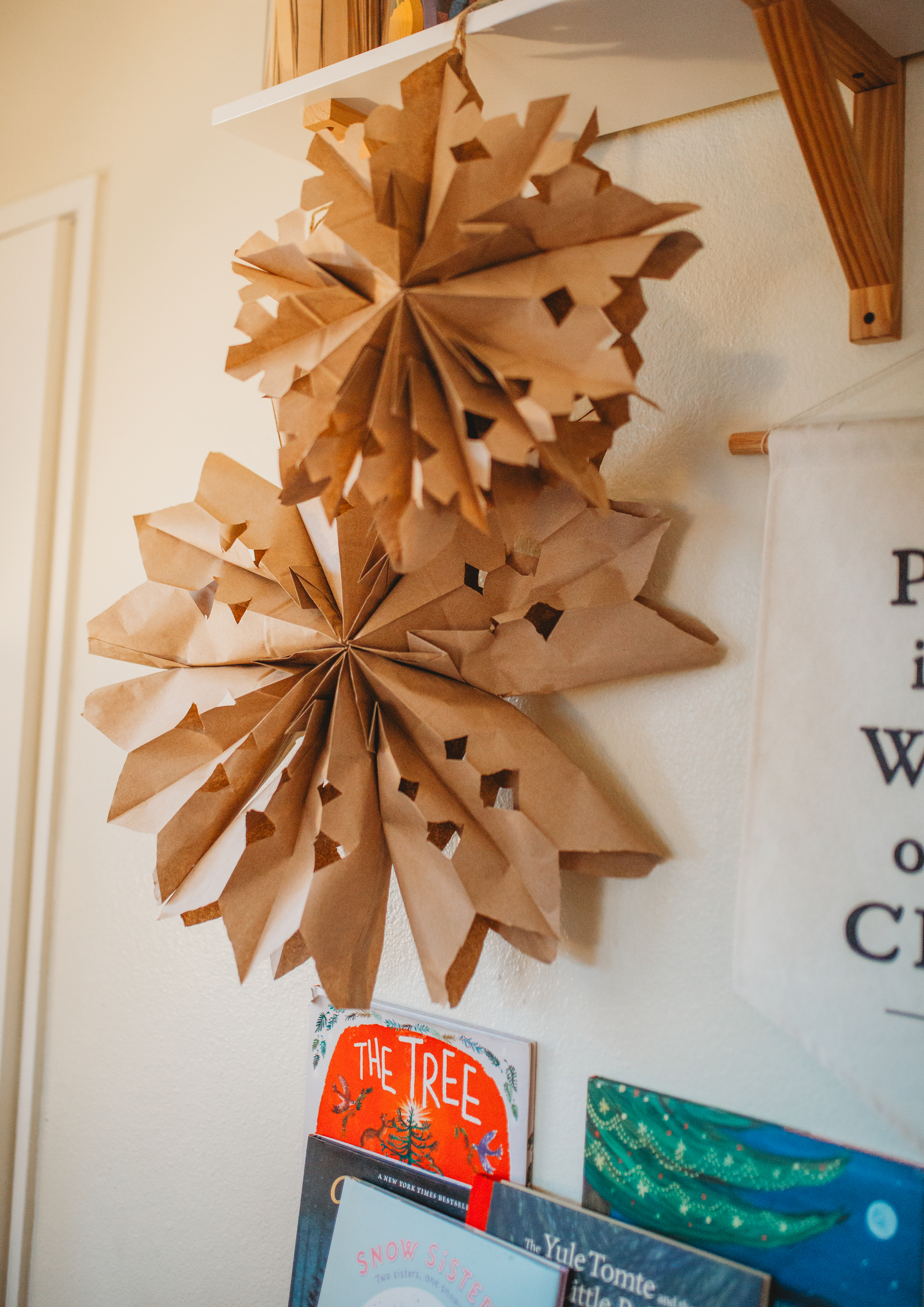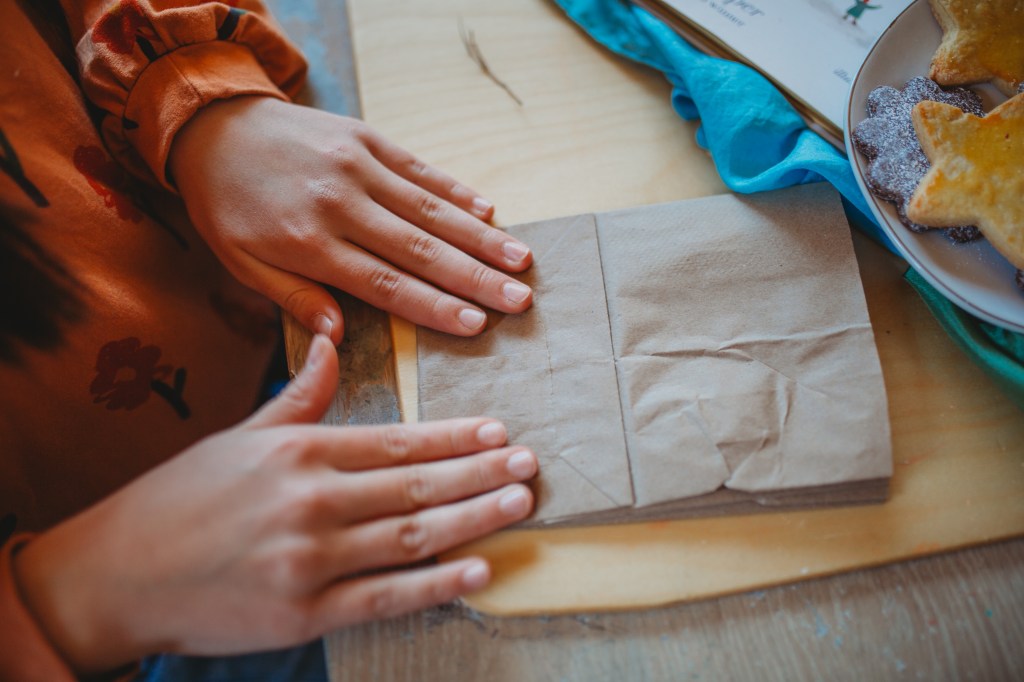 For our solstice craft, I chose to make paper bag snowflakes simple yet beautiful, and the perfect way to bring a little winter magic indoors. While I’d typically go for something “snowy,” this project felt like a wonderful way to celebrate the season with a little fake snow of our own. Plus, we’ll be collecting sticks for an upcoming craft on Three Kings Day, so stay tuned for that next month!
